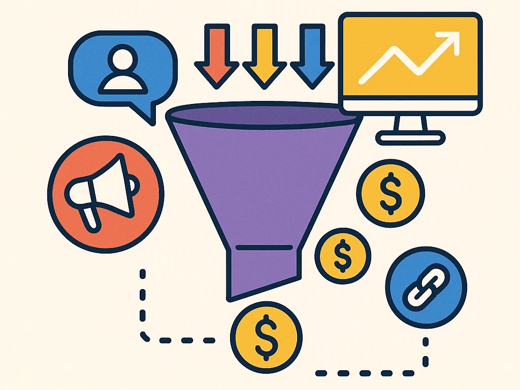 A clean graphic showing a lead funnel: website visitor → landing page → lead form → CRM with nurturing workflow.